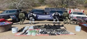 En el lugar fue asegurada un arma de fuego, así como varios envoltorios que contenían una sustancia con características de metanfetamina.